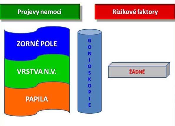 • objektivní - glaukomová neuropathie korelující s výpadkem ve vrstvě nervových vláken /zde jsou velkým přínosem zobrazovací metody HRT3 + SOCT + digitální fotografie/