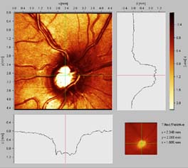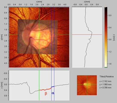 Pohybem štěrbinové lampy pak světelný proužek posuneme mezi terč a foveolou. Pohledem srovnáváme žíhání sítnice směrem dovnitř od velkých cévních kmenů, srovnáváme rozdíl mezi horními a dolními svazky vláken. U zdravého oka bývá žíhání a zastření cévních kmenů směřujících do makuly výraznější v dolní polovině sítnice než v horní.