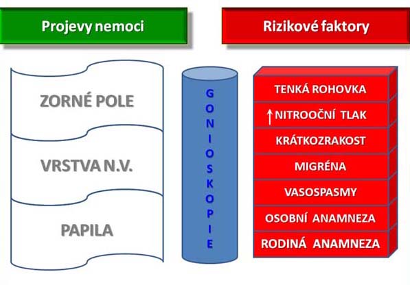 Pacienty, u kterých máme v běžné praxi podezření na glaukom, je potřeba vyšetřit systematicky, pátrat po rizikových faktorech a po projevech glaukomu. Rizikové faktory a projevy glaukomu je potřeba od sebe důsledně oddělovat.