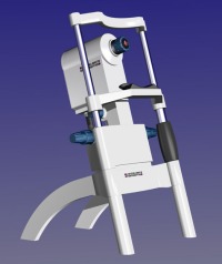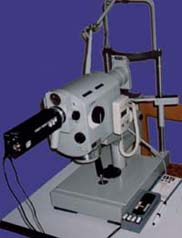 Nastavení lampy: zelené světlo paralelně s osou našeho pohledu, paprsek co nejvíce vertikálně protažený, aby pokryl oblast horních i dolním temporálních nervových svazečků. Zaostříme na terč tak, abychom ho viděli prostorově.
