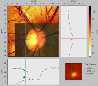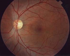 Pohybem štěrbinové lampy pak světelný proužek posuneme mezi terč a foveolou. Pohledem srovnáváme žíhání sítnice směrem dovnitř od velkých cévních kmenů, srovnáváme rozdíl mezi horními a dolními svazky vláken. U zdravého oka bývá žíhání a zastření cévních kmenů směřujících do makuly výraznější v dolní polovině sítnice než v horní.